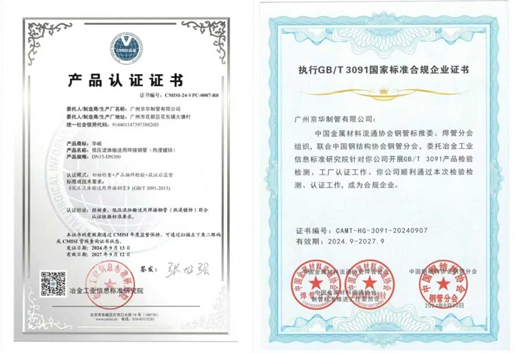 1、2024年4月13日,广州市花都区科工信局副局长温和顺一行莅临我司暖企指导。 2、2024年4月24日,广州市花都区鲲鹏计划工作组莅临我司调研指导。 3、2024年5月18日,广州京华制管有限公司工会委员会荣获“2023年广州市五星级工会组织”称号。 4、2024年8月6日,广州市花都区生态环境产业协会莅临我司考察指导工作。 5、2024年9月2日,佛山市三水振鸿钢制品有限公司总裁曾令均一行莅临我司交流学习。 6、2024年9月23日,广州市花都区花东镇党委书记王卫华莅临我司检查指导工作。 7、2024年11月14日,广州京华制管有限公司成功取得低压流体输送用焊接钢管(热浸镀锌)产品认证,荣获执行GB/T3091-2015国家标准合规企业称号。